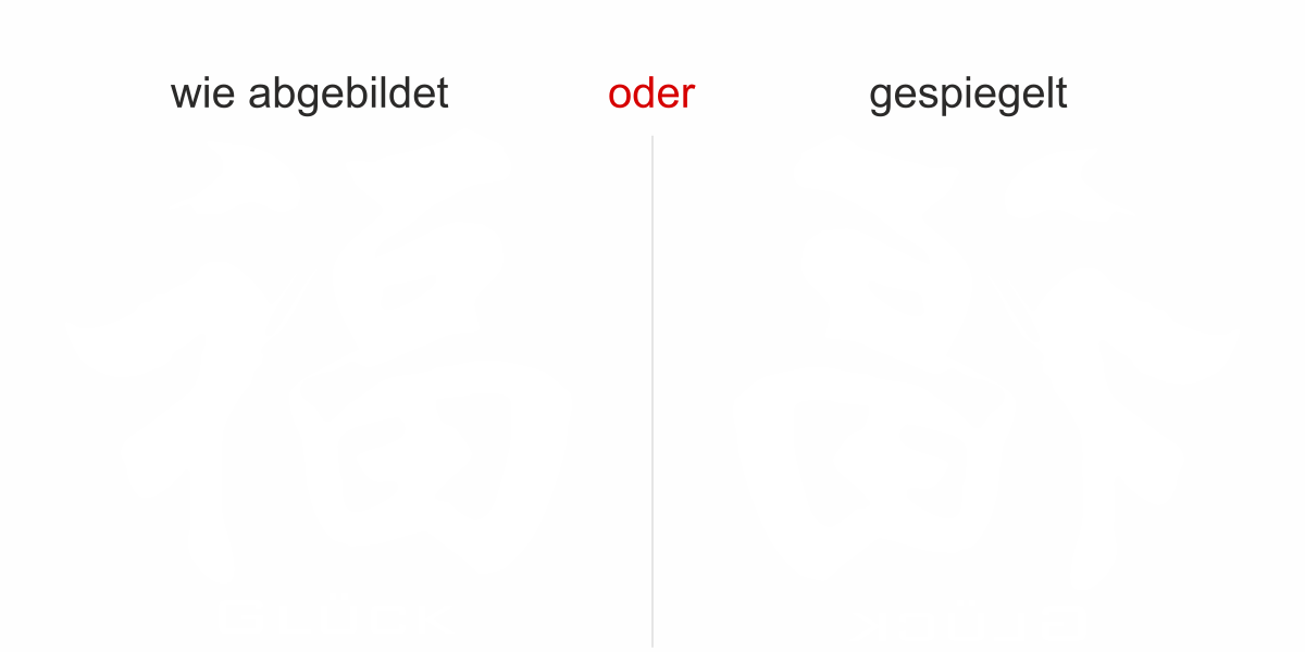 Objekt gespiegelt, Text wie abgebildet = Motiv/Text von außen geklebt und von außen lesbar, jedoch Motiv auf der anderen Seite