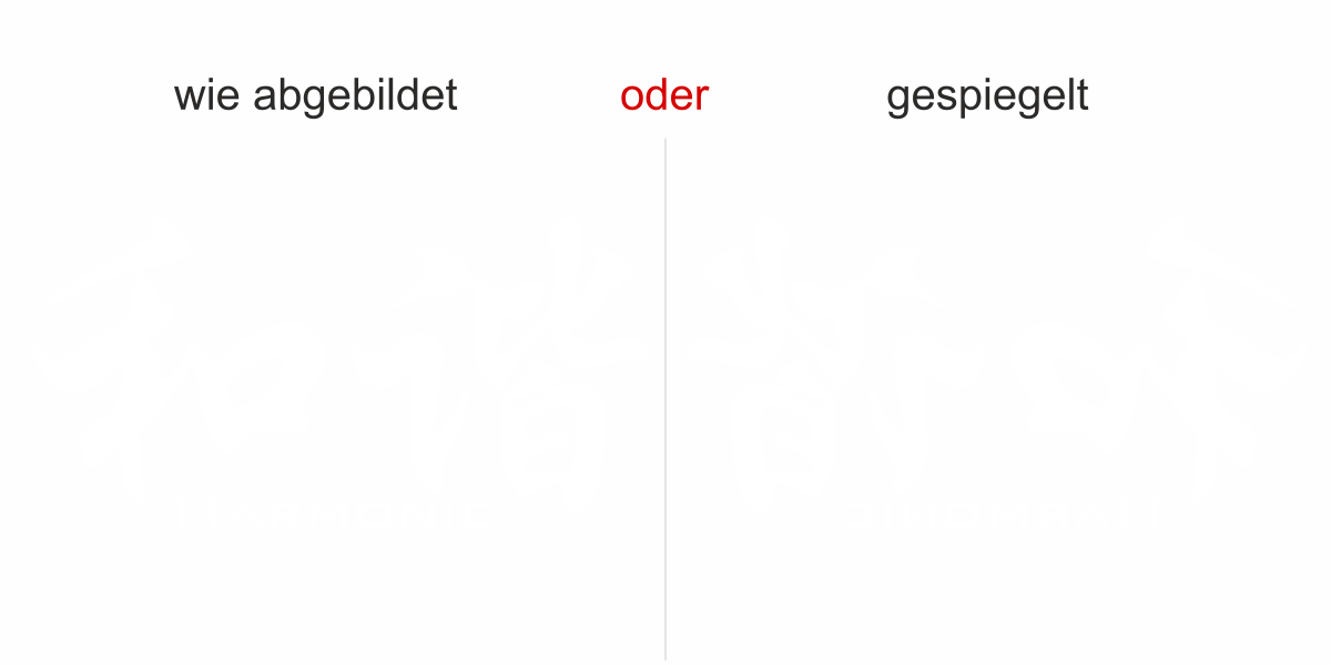 Objekt gespiegelt, Text wie abgebildet = Motiv/Text von außen geklebt und von außen lesbar, jedoch Motiv auf der anderen Seite