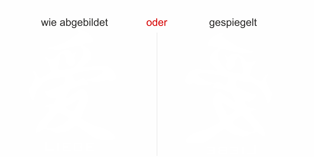 Objekt gespiegelt, Text wie abgebildet = Motiv/Text von außen geklebt und von außen lesbar, jedoch Motiv auf der anderen Seite