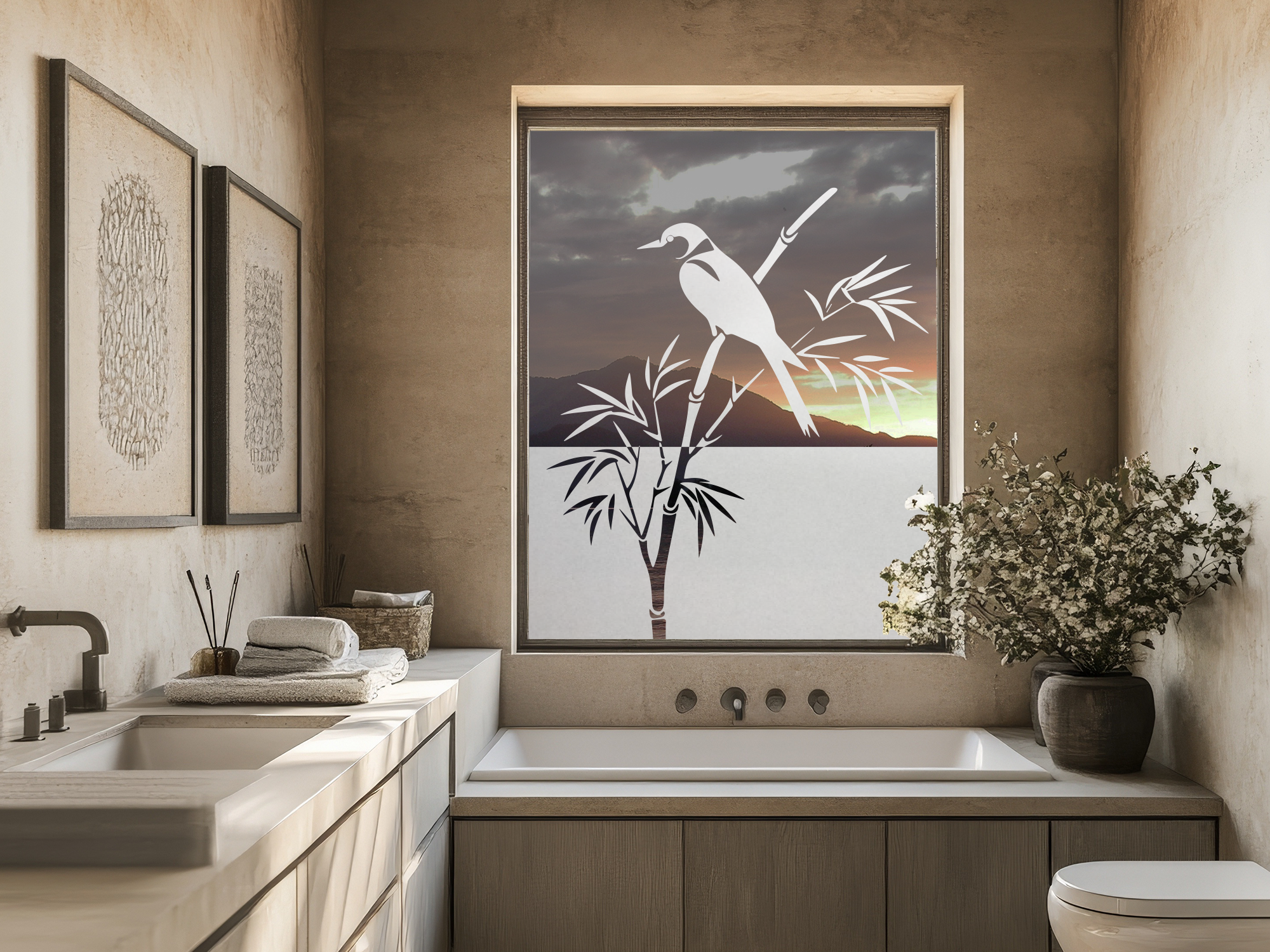 Sichtschutz Fensterfolie mit Bambuszweig und Vogel, als klassisches Motiv der japanischen Kunst
