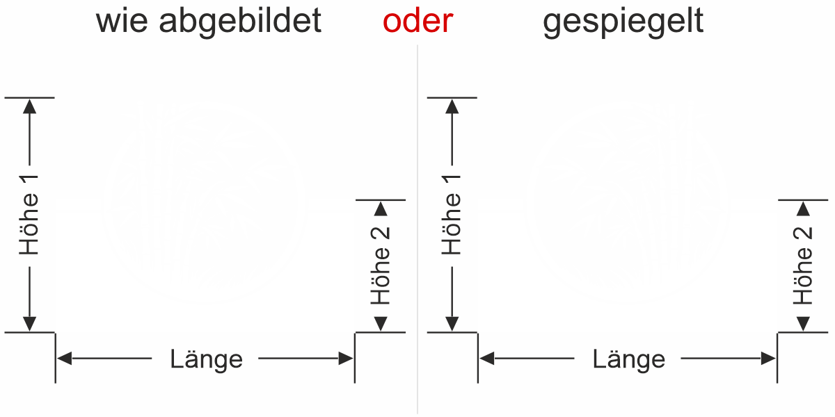 Wenn Sie einen Sichtschutz über Ihre gesamte Fläche benötigen, bitte bei Höhe 1 und Höhe 2 das gleiche Maß eingeben.