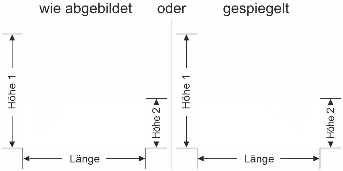 Wenn Sie einen Sichtschutz über Ihre gesamte Fläche benötigen, bitte bei Höhe 1 und Höhe 2 das gleiche Maß eingeben.