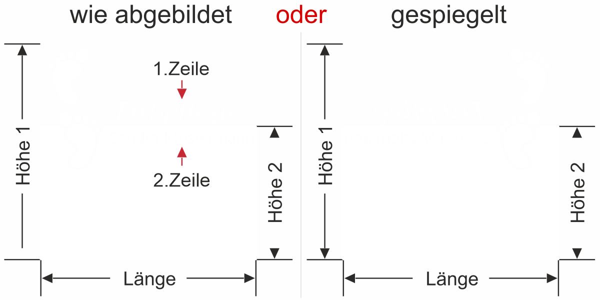 Objekt gespiegelt, Text wie abgebildet = Motiv/Text von außen geklebt und von außen lesbar, jedoch Motiv auf der anderen Seite