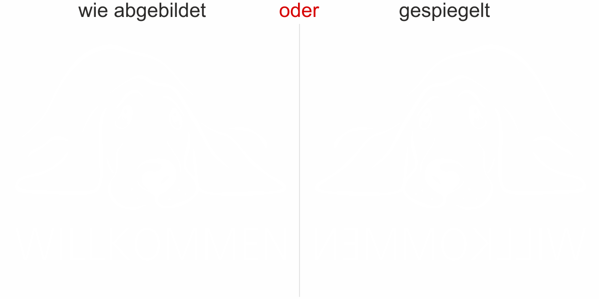 Objekt gespiegelt, Text wie abgebildet = Motiv/Text von außen geklebt und von außen lesbar, jedoch Motiv auf der anderen Seite