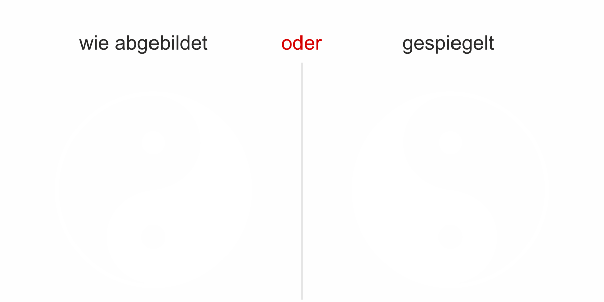 Objekt gespiegelt, Text wie abgebildet = Motiv/Text von außen geklebt und von außen lesbar, jedoch Motiv auf der anderen Seite
