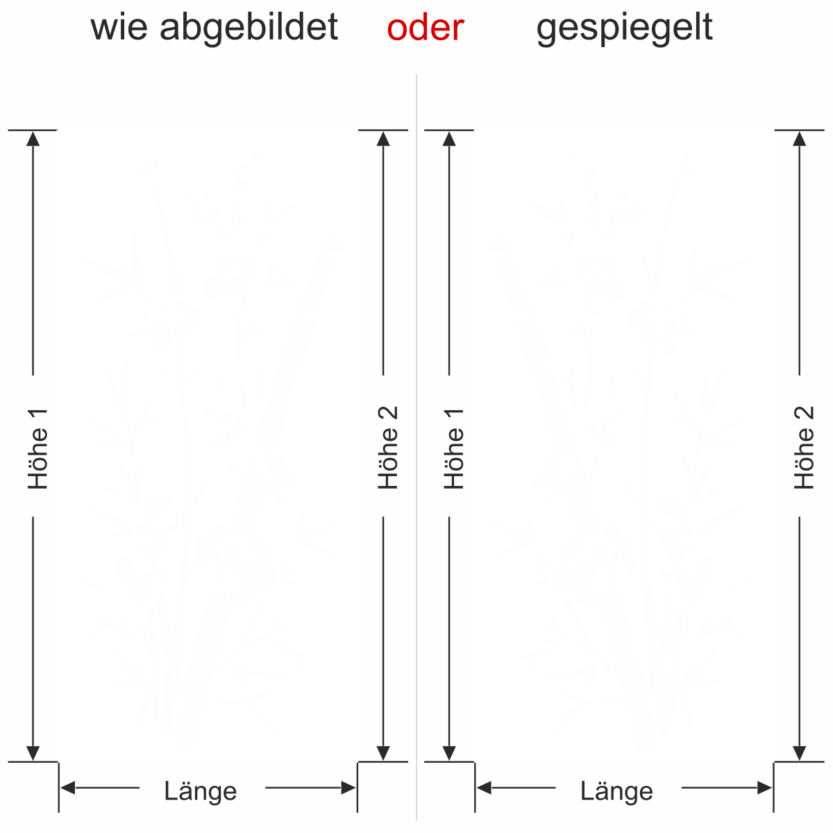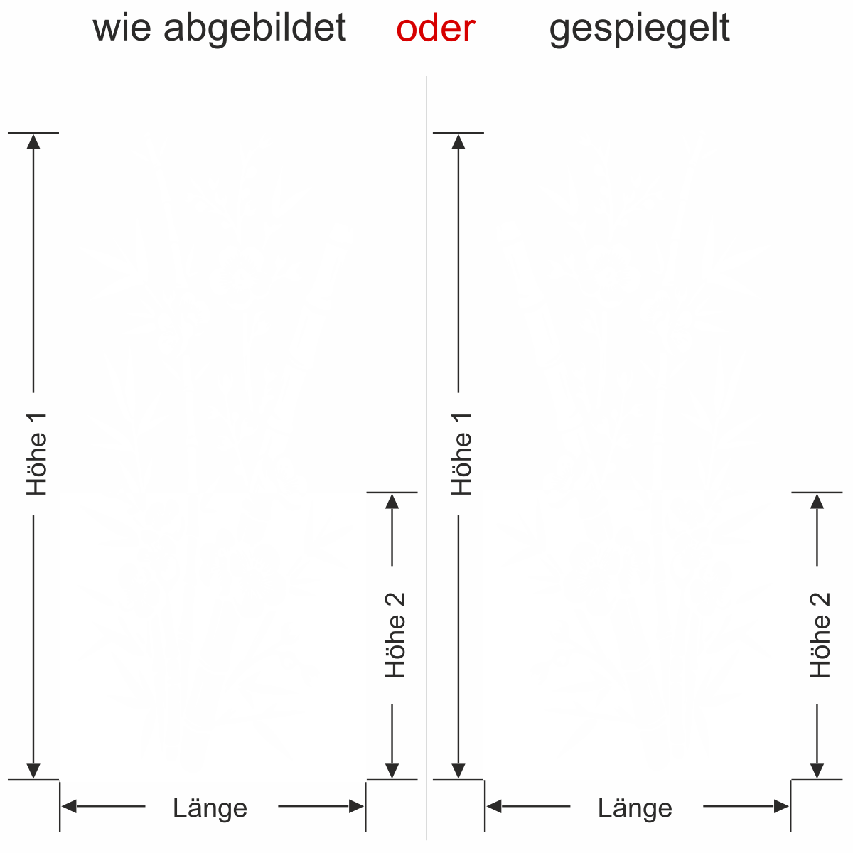 Wenn Sie einen Sichtschutz über Ihre gesamte Fläche benötigen, bitte bei Höhe 1 und Höhe 2 das gleiche Maß eingeben.