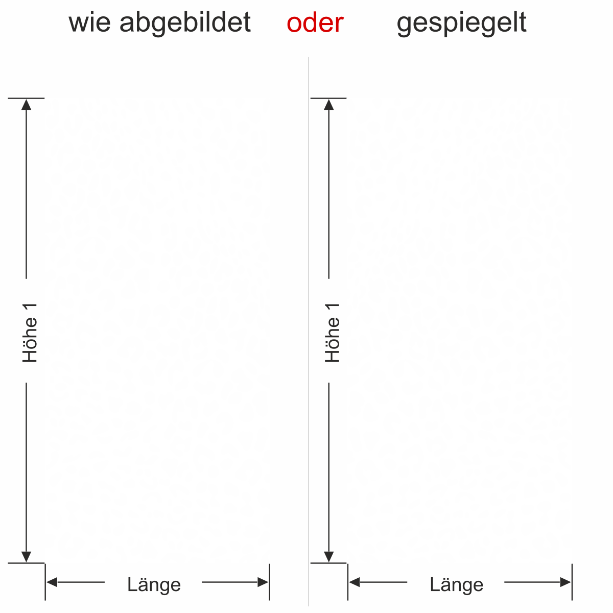 Objekt gespiegelt, Text wie abgebildet = Motiv/Text von außen geklebt und von außen lesbar, jedoch Motiv auf der anderen Seite
