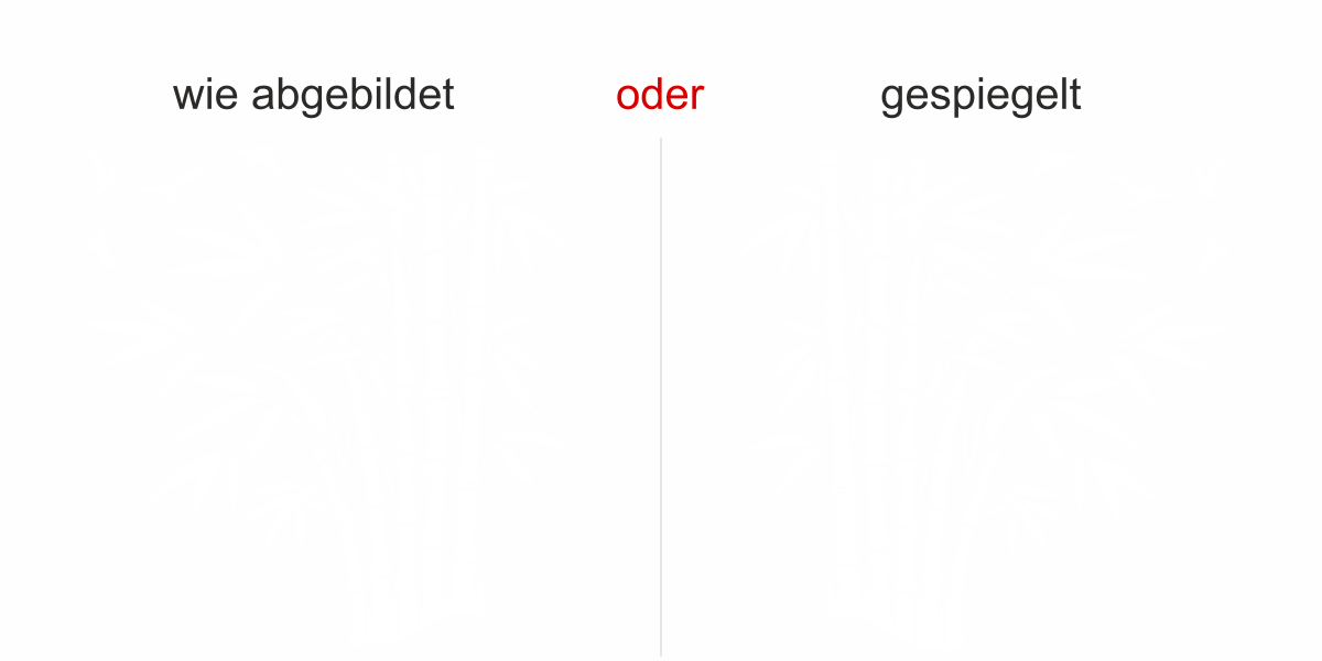 Objekt gespiegelt, Text wie abgebildet = Motiv/Text von außen geklebt und von außen lesbar, jedoch Motiv auf der anderen Seite