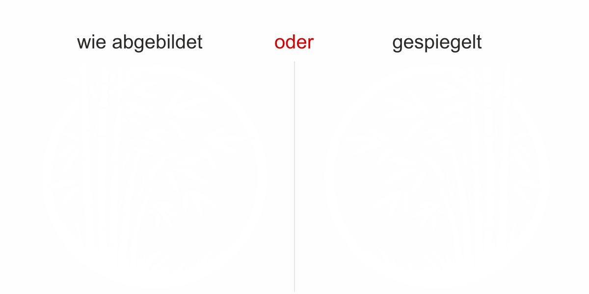 Objekt gespiegelt, Text wie abgebildet = Motiv/Text von außen geklebt und von außen lesbar, jedoch Motiv auf der anderen Seite