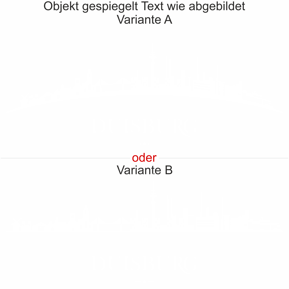 Objekt gespiegelt, Text wie abgebildet = Motiv/Text von innen geklebt und von innen lesbar, jedoch Motiv auf der anderen Seite