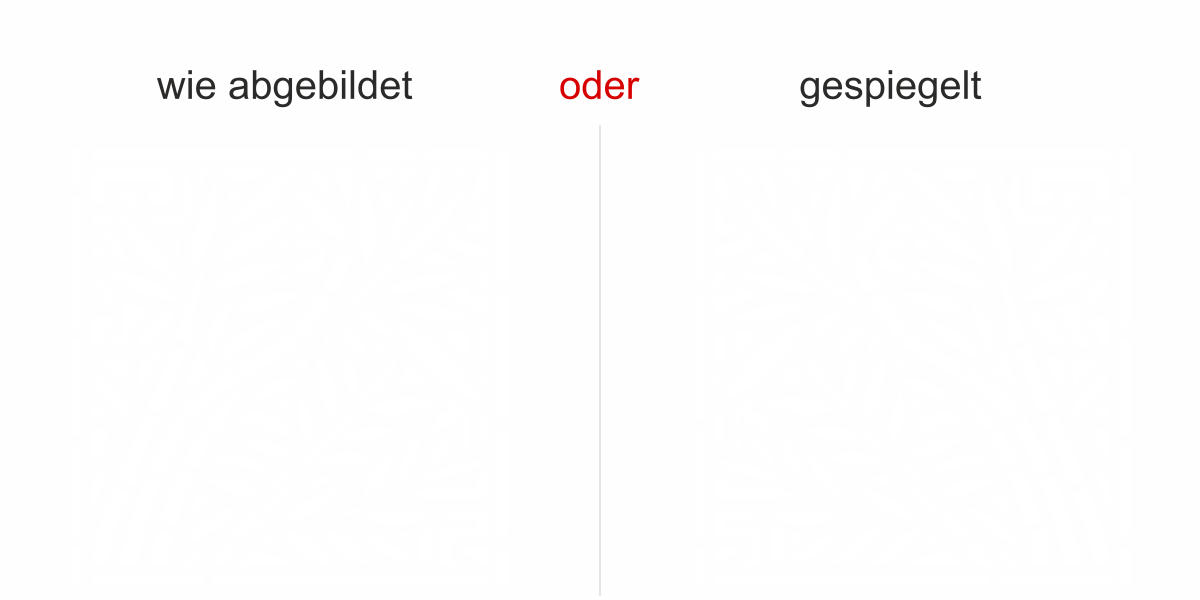 Objekt gespiegelt, Text wie abgebildet = Motiv/Text von außen geklebt und von außen lesbar, jedoch Motiv auf der anderen Seite
