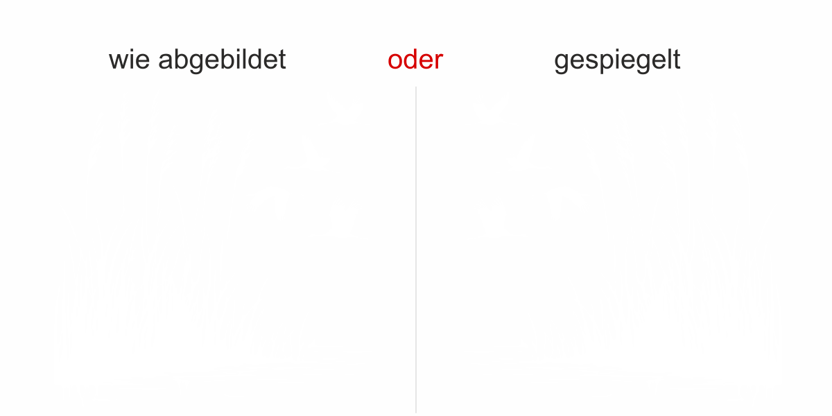 Objekt gespiegelt, Text wie abgebildet = Motiv/Text von außen geklebt und von außen lesbar, jedoch Motiv auf der anderen Seite