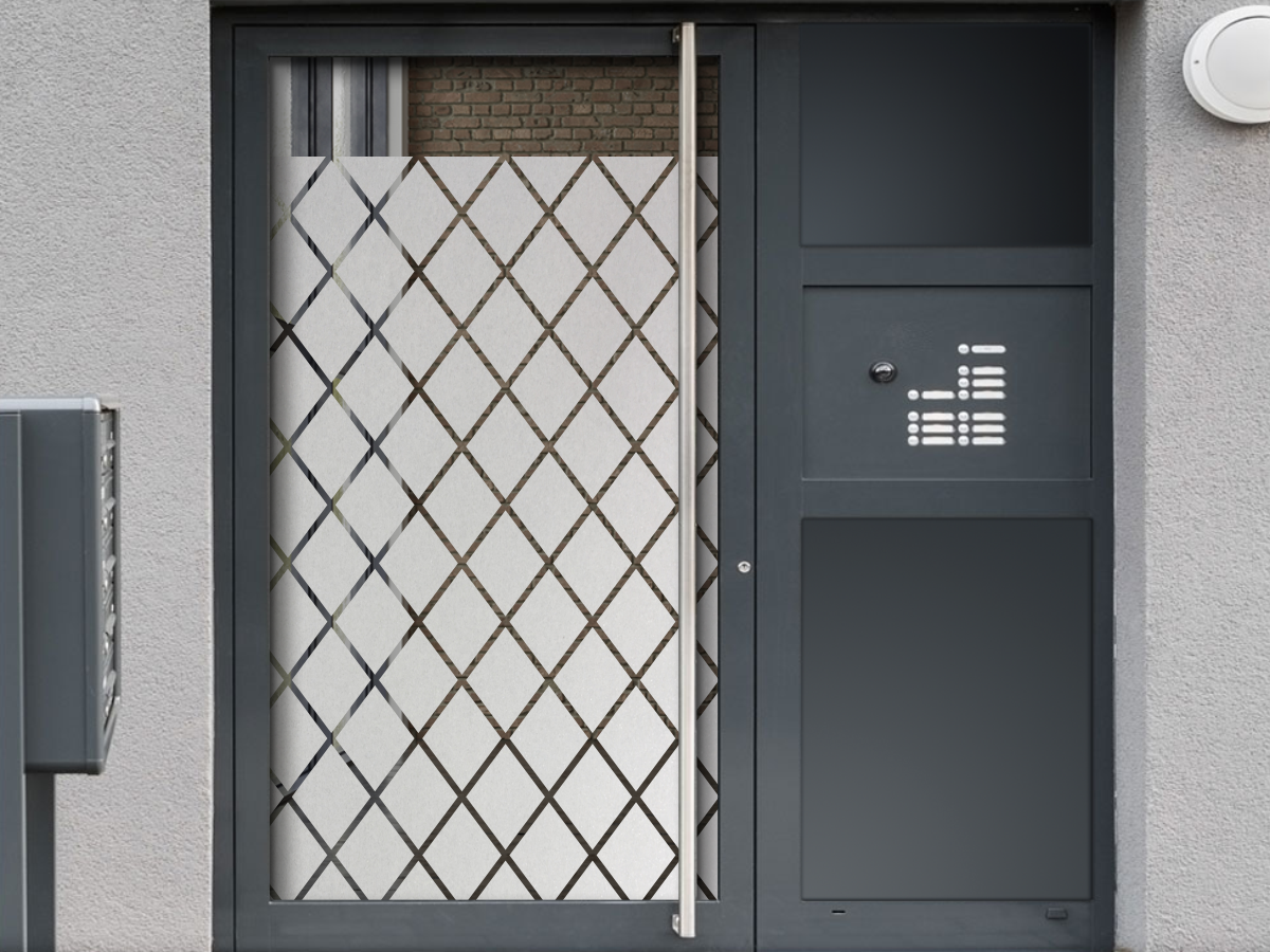 Sichtschutz Milchglasfolie mit ca. 20 x 15 cm großen Rauten und ca. 1 cm Abstand dazwischen