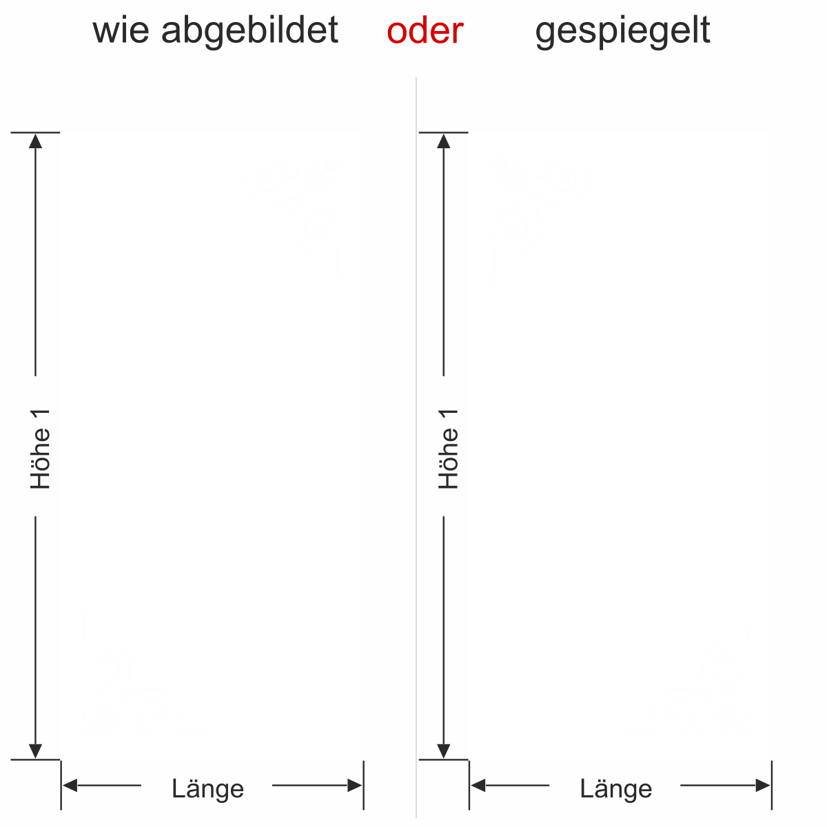 Objekt gespiegelt, Text wie abgebildet = Motiv/Text von außen geklebt und von außen lesbar, jedoch Motiv auf der anderen Seite