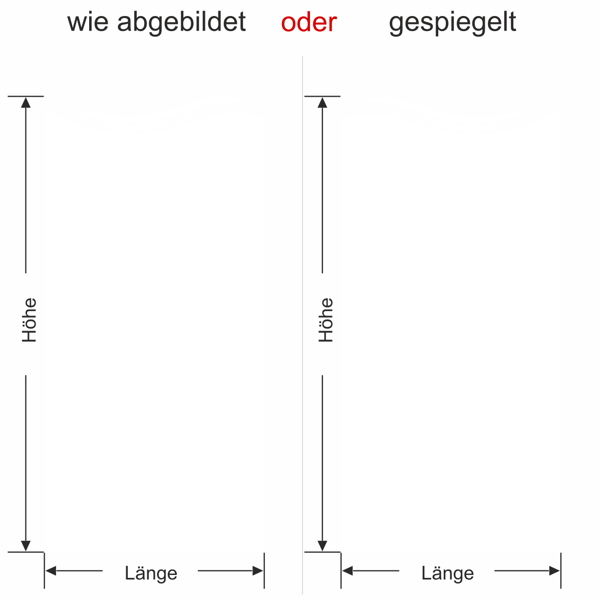 Objekt gespiegelt, Text wie abgebildet = Motiv/Text von außen geklebt und von außen lesbar, jedoch Motiv auf der anderen Seite