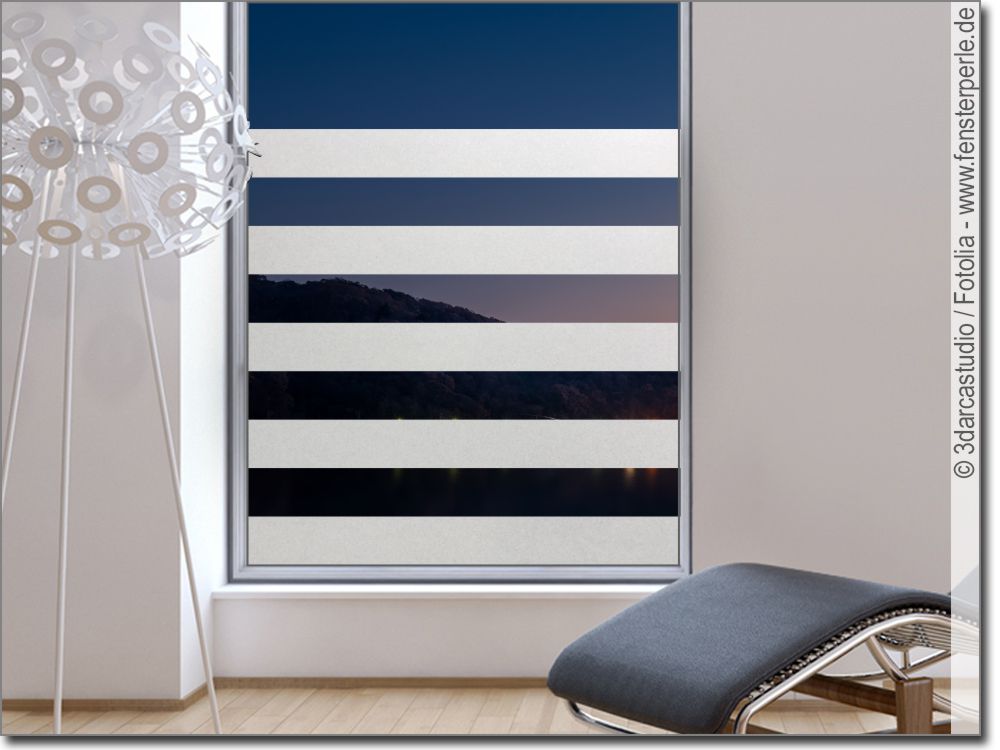 Sichtschutz Milchglasfolie mit ca. 10 cm hohen horizontalen Streifen und ca. 10 cm Abstand dazwischen