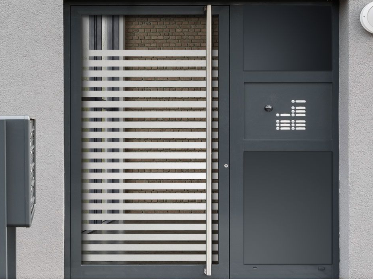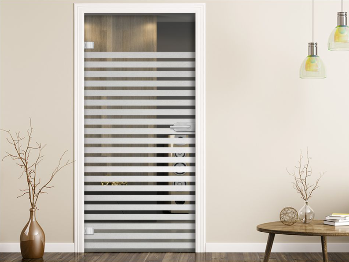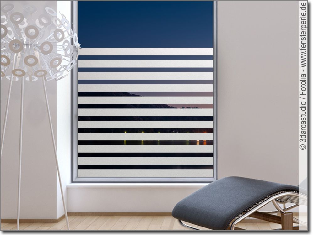 Sichtschutz Milchglasfolie mit ca. 5 cm hohen horizontalen Streifen und ca. 3 cm Abstand dazwischen