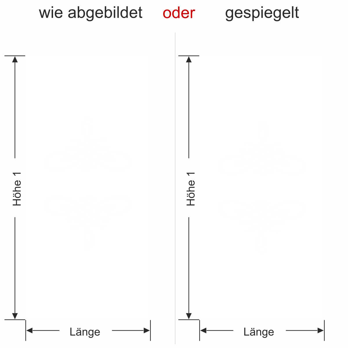 Objekt gespiegelt, Text wie abgebildet = Motiv/Text von außen geklebt und von außen lesbar, jedoch Motiv auf der anderen Seite