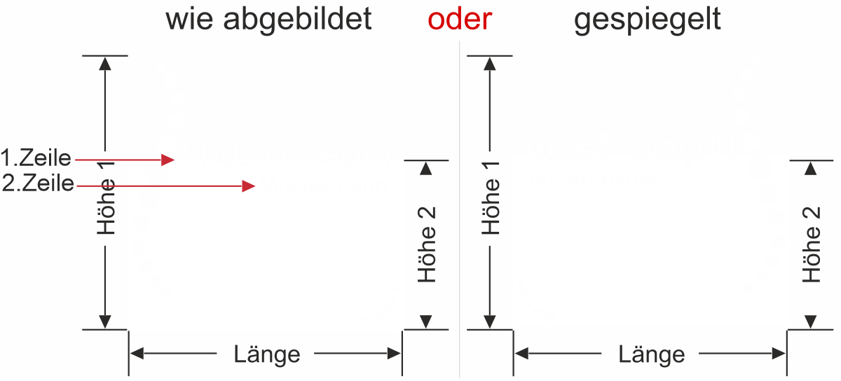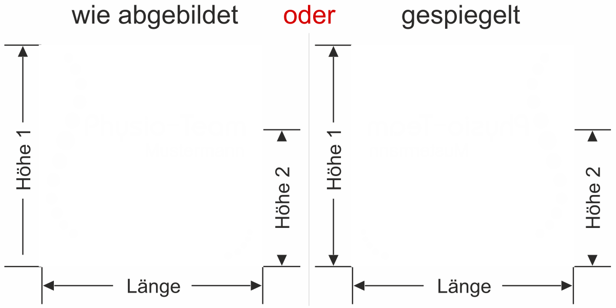 Objekt gespiegelt, Text wie abgebildet = Motiv/Text von außen geklebt und von außen lesbar, jedoch Motiv auf der anderen Seite