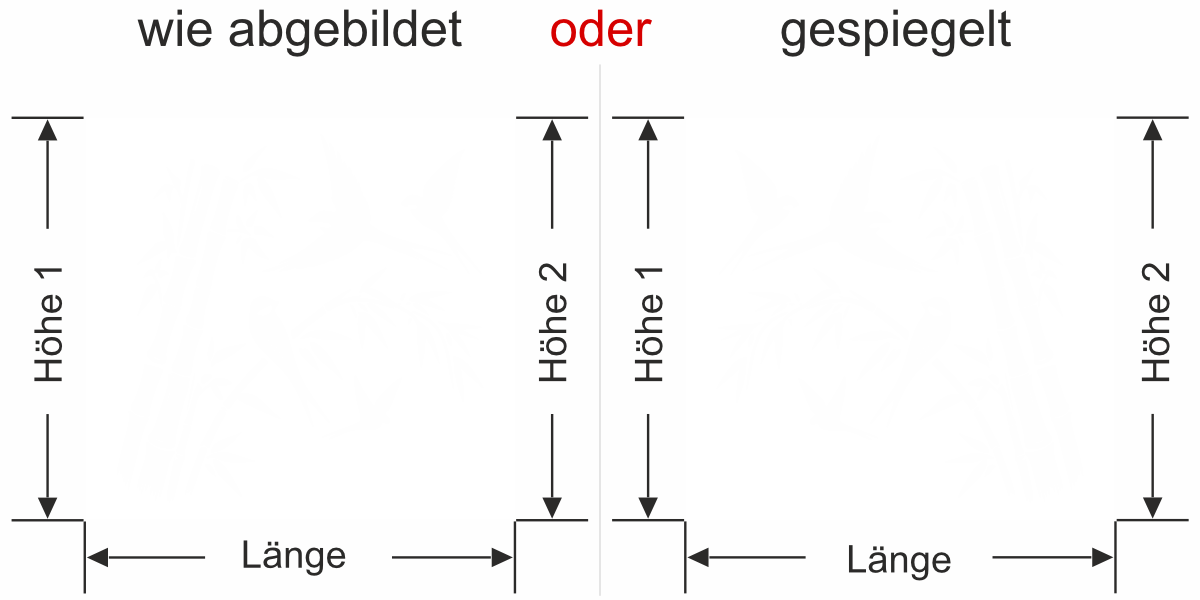 Objekt gespiegelt, Text wie abgebildet = Motiv/Text von außen geklebt und von außen lesbar, jedoch Motiv auf der anderen Seite