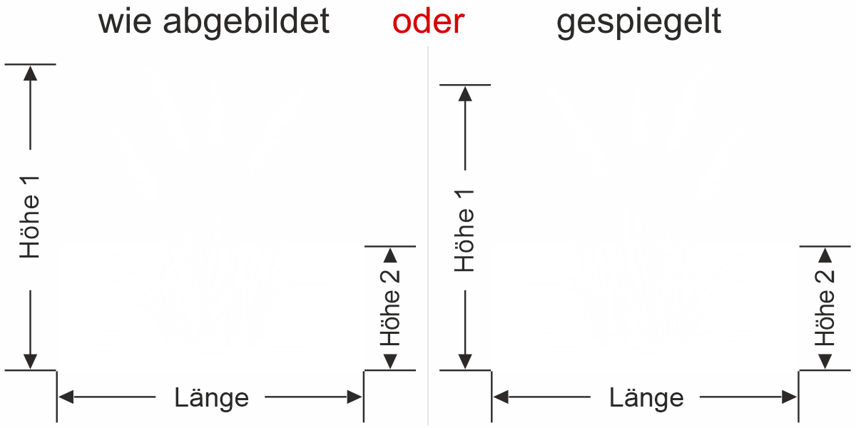 Wenn Sie einen Sichtschutz über Ihre gesamte Fläche benötigen, bitte bei Höhe 1 und Höhe 2 das gleiche Maß eingeben.