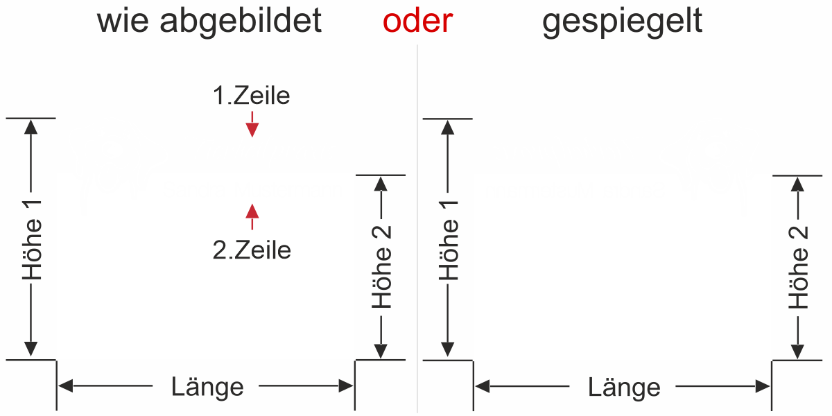 Objekt gespiegelt, Text wie abgebildet = Motiv/Text von außen geklebt und von außen lesbar, jedoch Motiv auf der anderen Seite